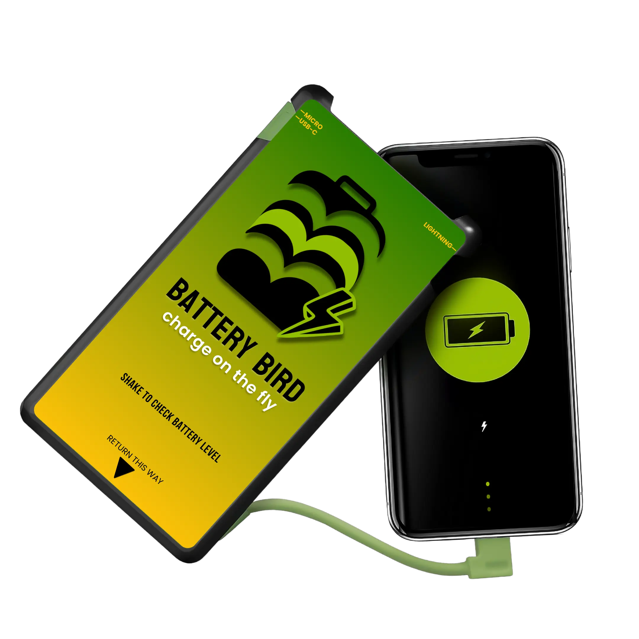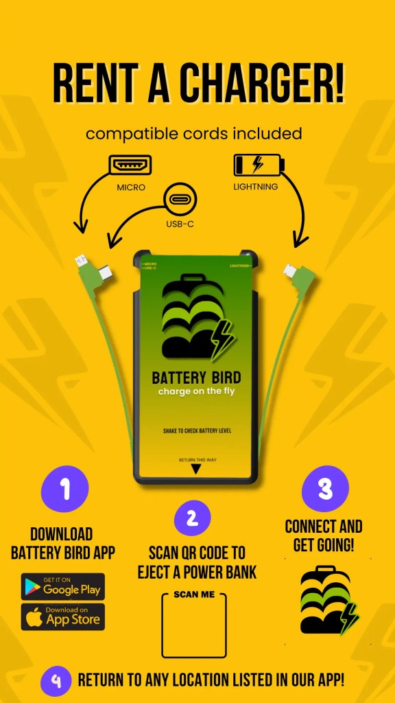 ➔ Customers have the flexibility to rent and recharge on-site — keeping them engaged longer — or take the unit with them to return to any Battery Bird location, boosting convenience and connectivity.